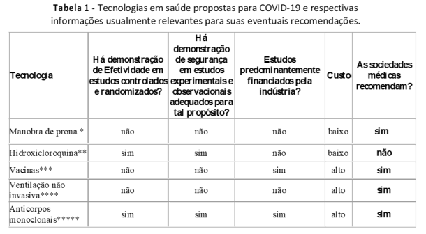 Já a vacina contra a Covid-19, segundo a tabela, tem custo alto, tem estudos “predominantemente financiados pela indústria” e é recomendada pelas entidades médicas.